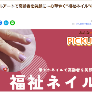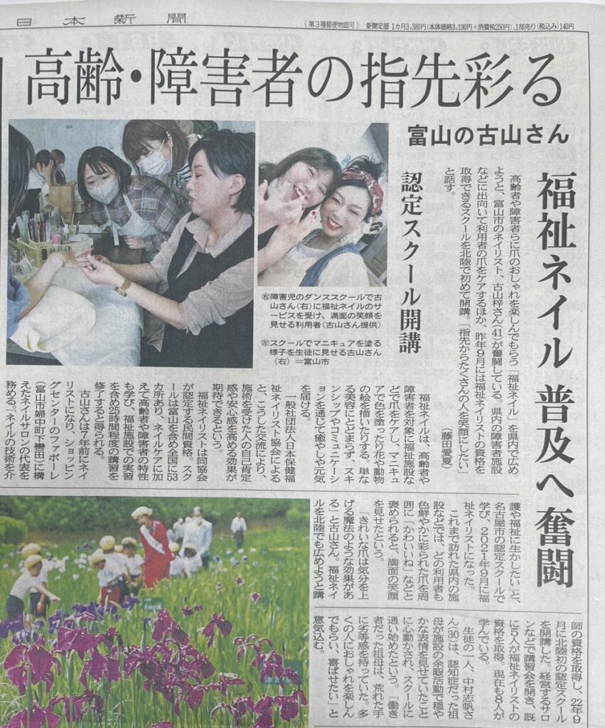 北日本新聞に古山梓先生の受講風景が掲載されました(2023年6月10日発刊) 2023.08.26 メディア掲載 Tweet Share RSS Pin it 北日本新聞 2023年6月10日発刊 富山県にて福祉ネイル富山堀川校が開校され、古山梓先生の受講風景が掲載されました。 多くの方が、この活動にやりがい感じていただけたらと思います Tweet Share RSS Pin it メディア掲載 KNBテレビのNews everyで富山県初の福祉ネイリスト認定校の開校が... 第4回研究集会が2023年11月4日(土)に開催決定! ピックアップ記事 お知らせ 第4回研究集会が2023年11月4日(土)に開催決定! 2023.09.07お知らせ, ブログ 関連記事一覧 メディア掲載 全国理美容新聞Vol.03に掲載されました。 2016.05.09 メディア掲載 今泉 泰枝(名古屋栄校卒業)さんが老人ホーム検索サイト『みん... 2023.08.03 お知らせ この度の 新潟、山形での地震発生につきまして、心よりお見舞い... 2019.06.21 ブログ 家族必見!認知症かんたんチェック方法5選! 2020.10.17