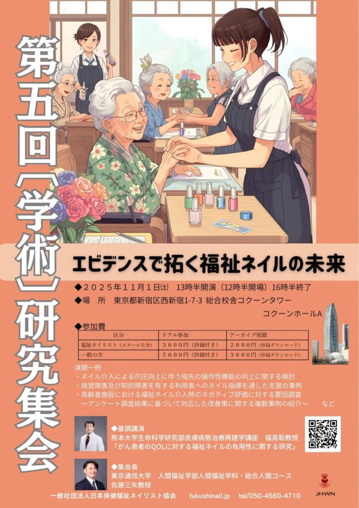 基調講演では、熊本大学大学院 生命科学研究部 皮膚病態治療再建学講座 福島聡教授より「がん患者への福祉ネイルの有用性」についてご講演いただきます。
