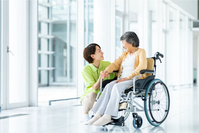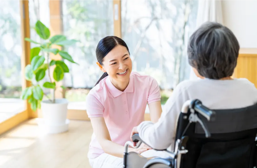 とくにベッドで寝ている状態の方や、車いす生活の方に話しかける場合、立ったままの姿勢だと高齢者の方を上から見下ろす形になり、高圧的・威圧的に感じてしまう方もいるかもしれません。
