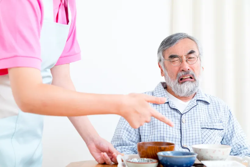 指示よりも強く相手の行動を制限・支配するニュアンスのある強要や命令口調も、介護時の声掛けとして適切ではありません。具体的には「早くしなさい」「そこに座りなさい」などの伝え方が強要や命令にあたり、指示と同様に依頼する形へ言い換えるのが望ましいとされます。