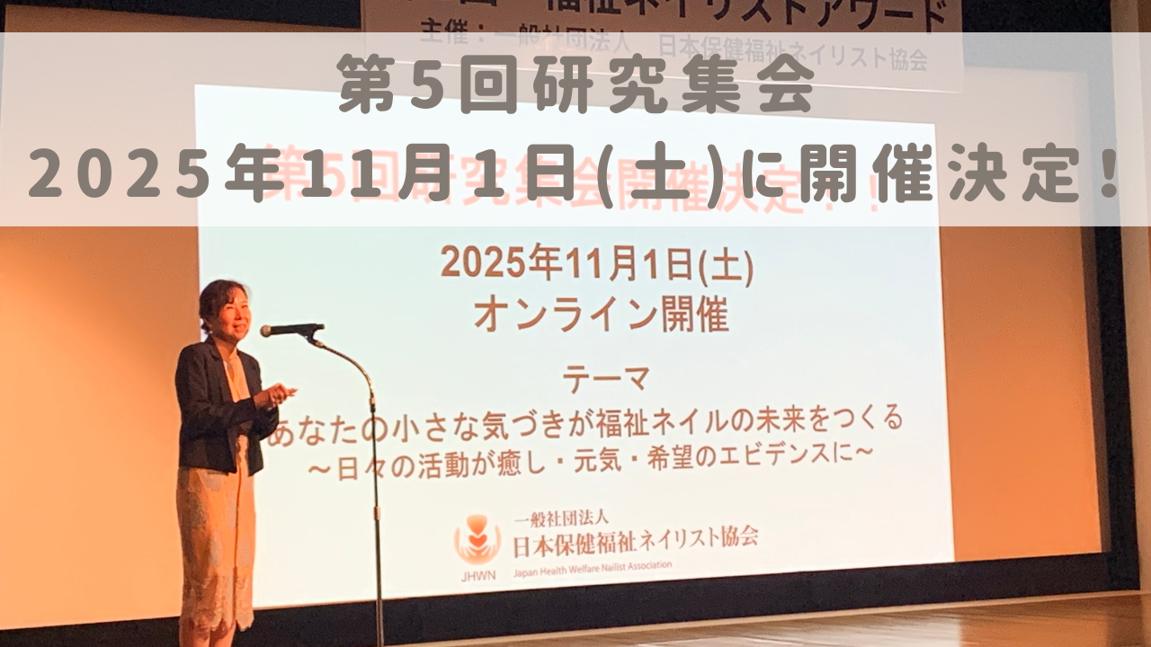 一般社団法人 日本保健福祉ネイリスト協会(以下、「当協会」という。)では、2019年からネイルに関する日本で初めての研究集会を開催しています。