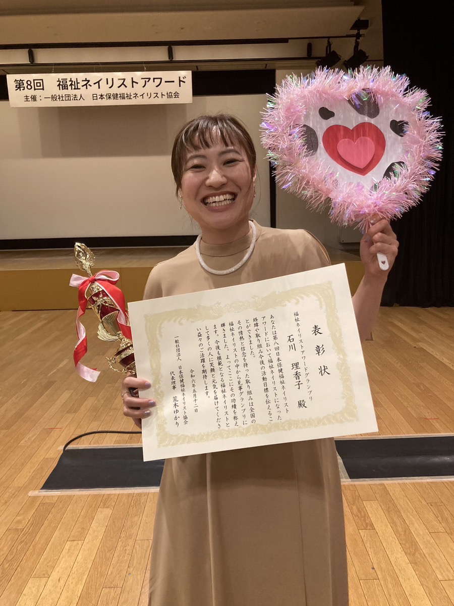 そんな福祉ネイリストという職業は、働き方やこれまでの経歴など多種多様です。今回は、看護師として働きながら、福祉ネイリストとしても活動し、2024年5月12日に行われた第8回福祉ネイリストアワードで見事グランプリを受賞された石川理香子さんに、福祉ネイリストの活動と想いを伺いました。