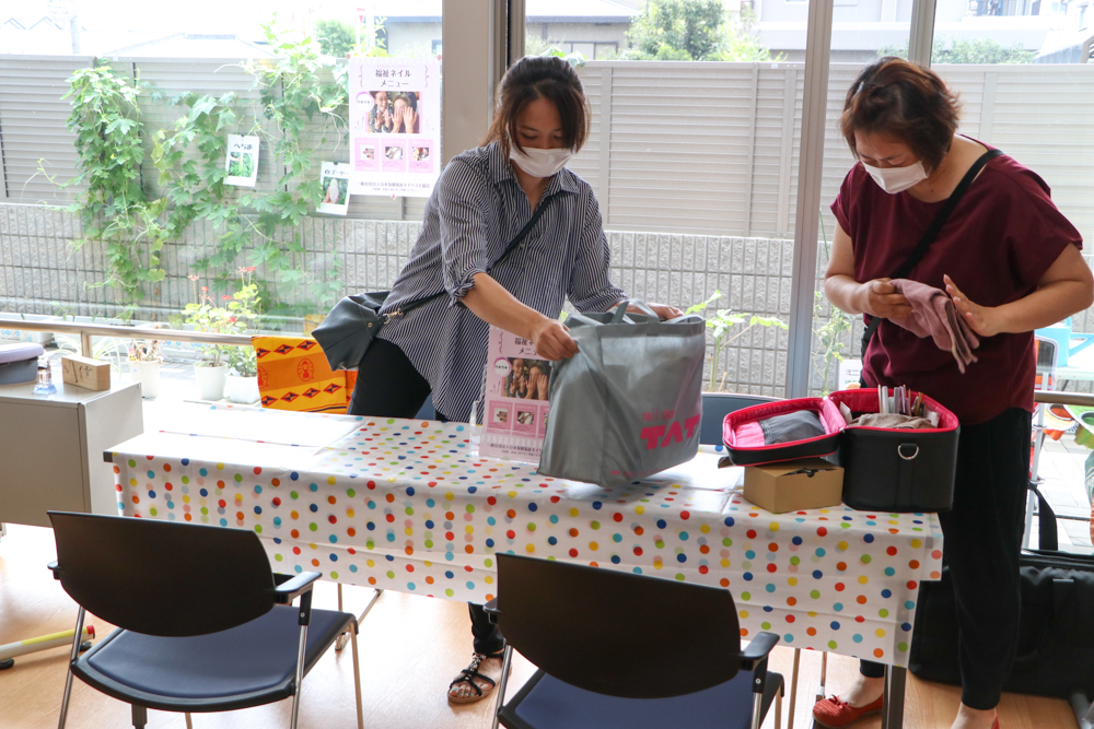 施術後も施設様のご迷惑にならないように自分たちで片付けをすることはもちろん、ゴミがないかやネイル溶剤が付近に付着していないかもしっかりと確認します。