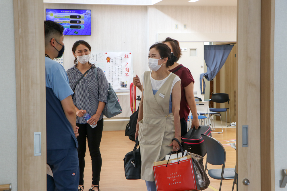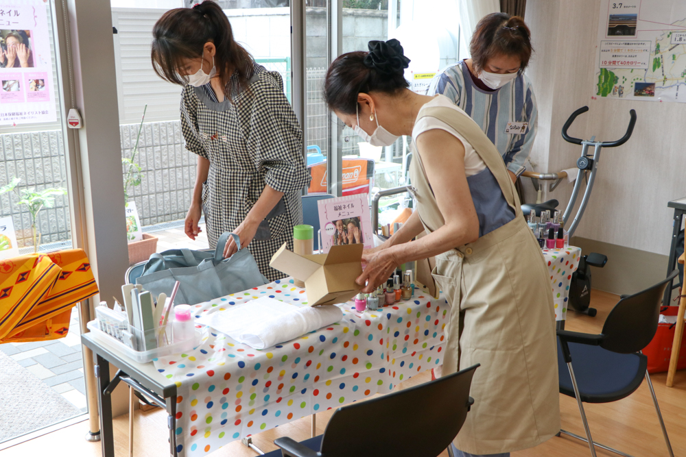 ほっと久米田様はデイサービスセンターということもあって比較的元気な高齢者が多いのが特徴。本日生徒と共にお世話になる旨を挨拶と共にお伝えしたのち、設営作業に入ります。